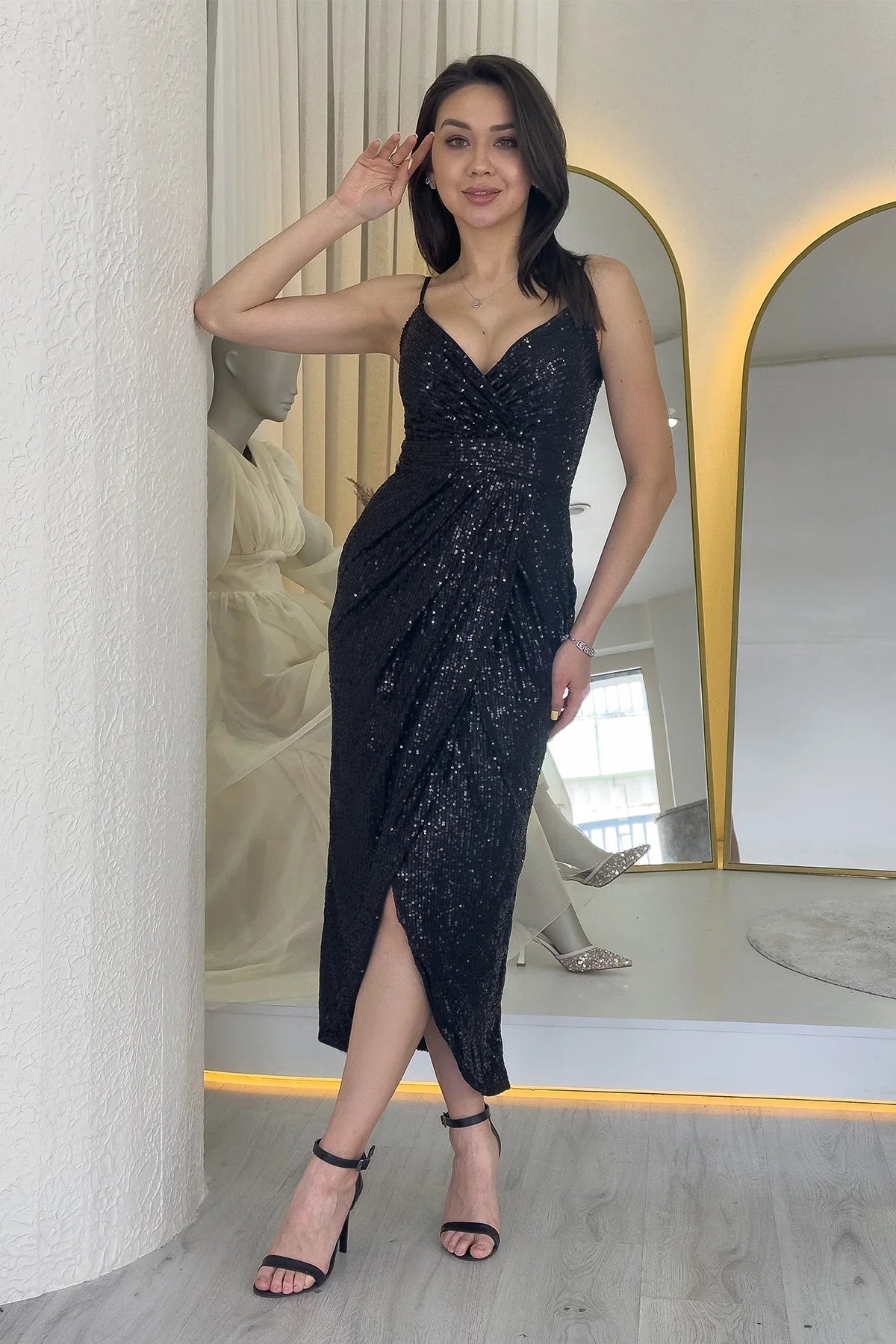 فستان سهرة أسود مزين بالترتر ذو حمالات رفيعة