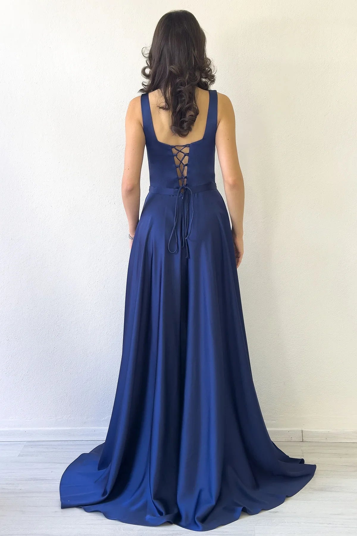 فستان سهرة ماكسي من الساتان باللون الأزرق الداكن