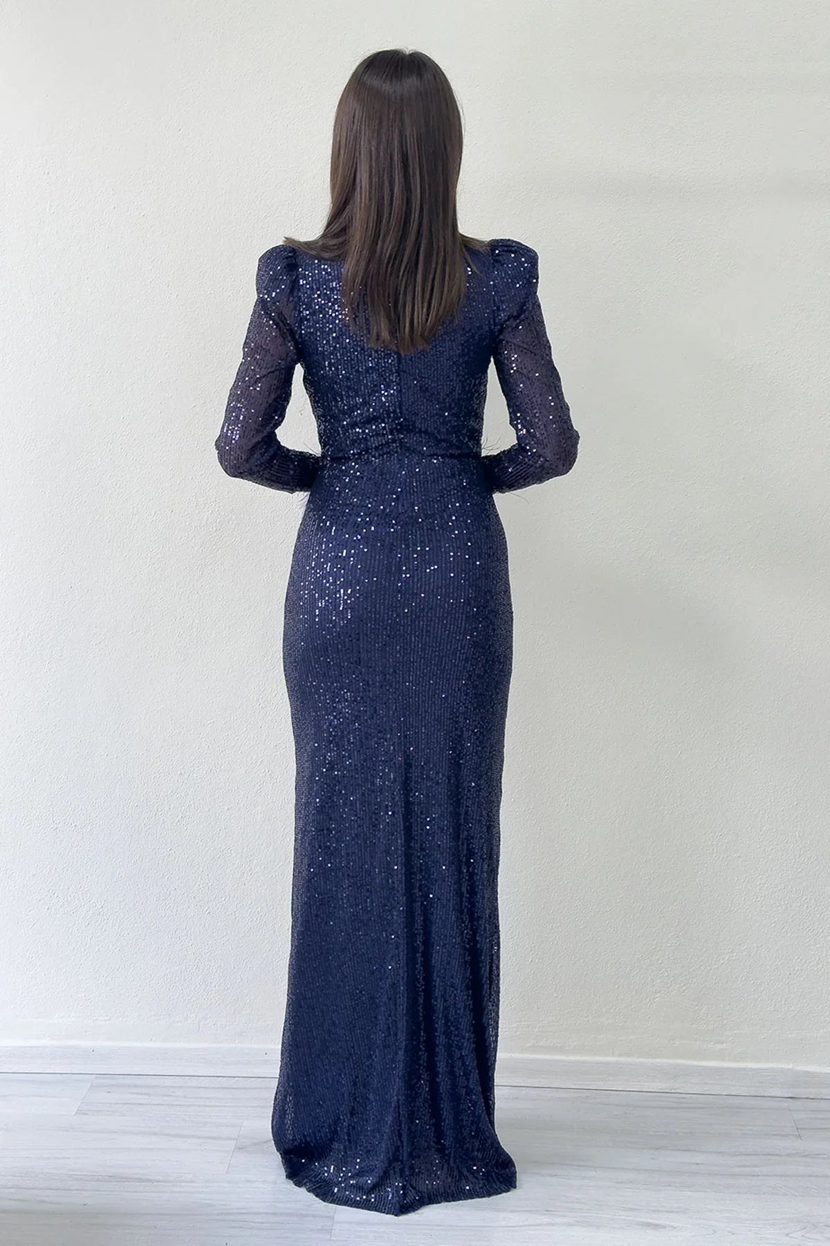 فستان سهرة ماكسي باللون الأزرق الداكن مزين بالترتر والريش