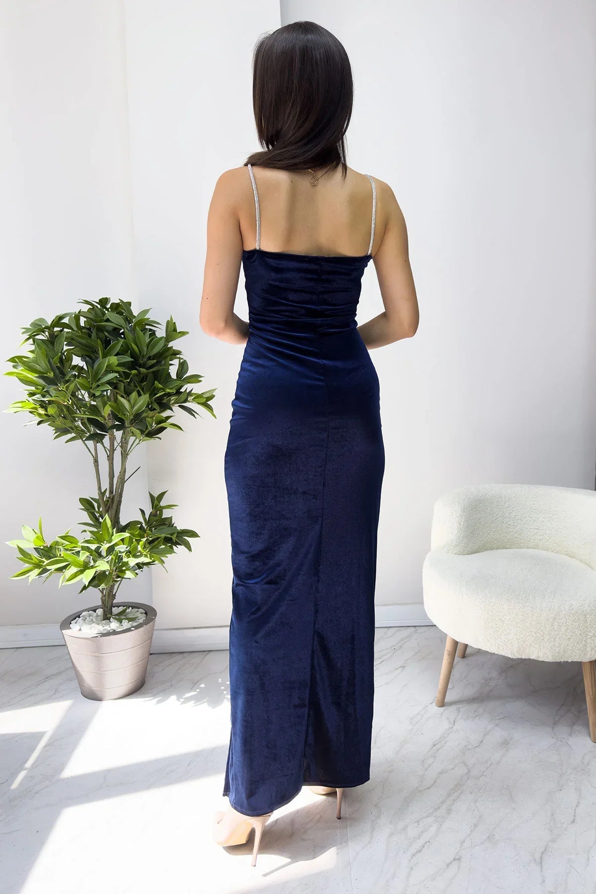 فستان سهرة ماكسي مخملي أزرق داكن بحمالات مزينة بأحجار