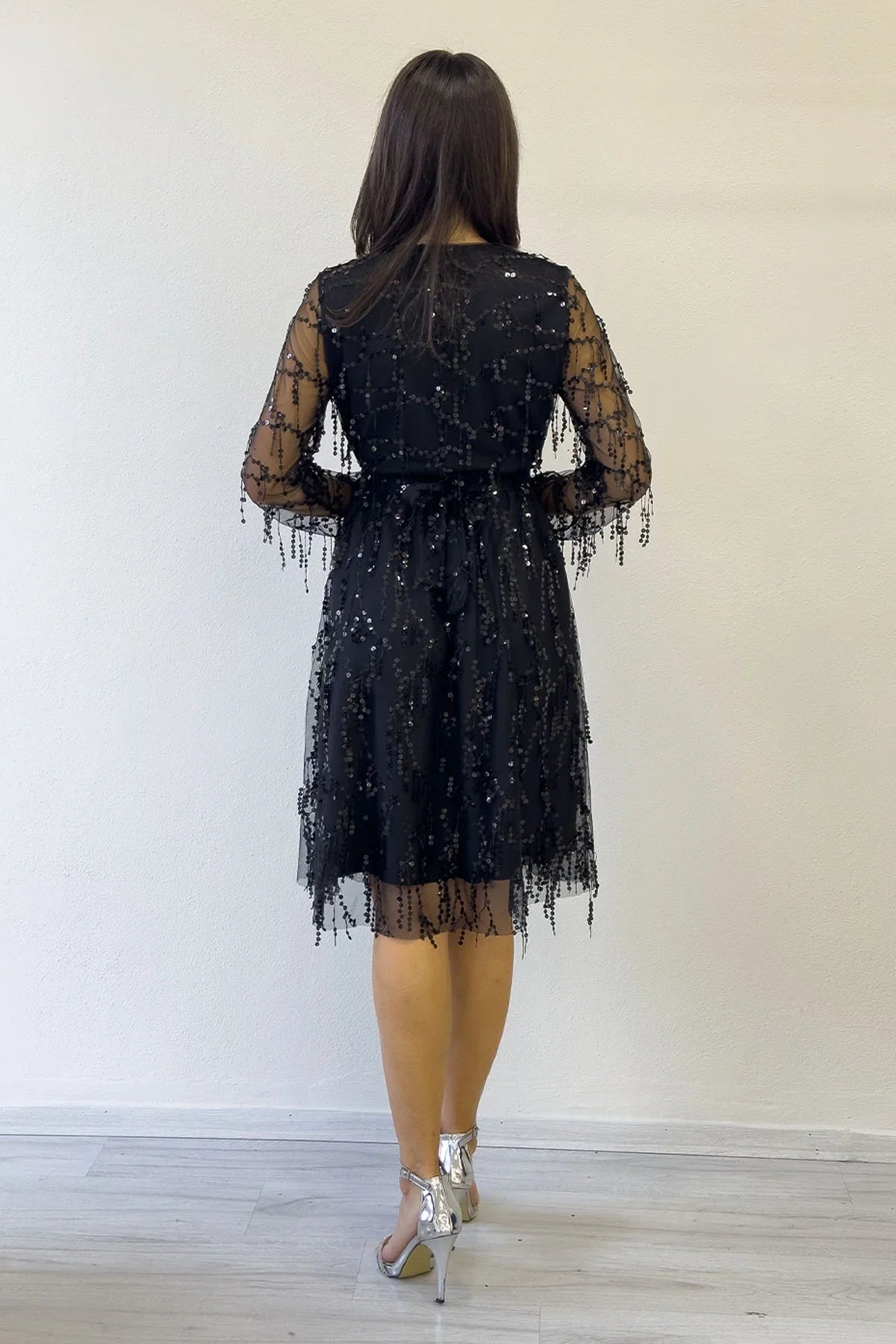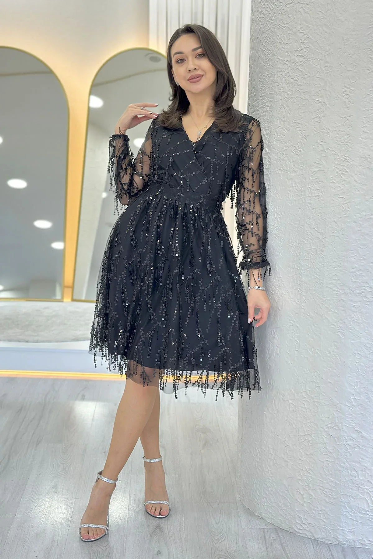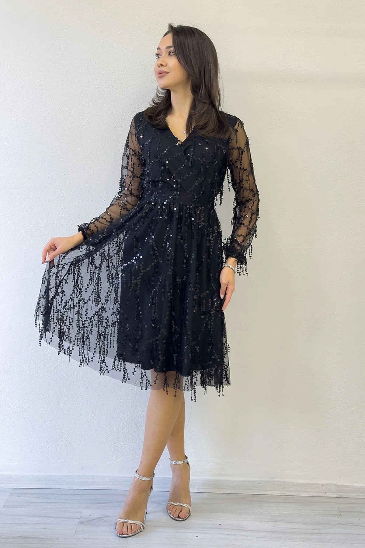 Women's V-Neck Tulle Plus Size Evening Dress - Black The Women's Sequined V-Neck Tulle Plus Size Evening Dress - Black, with its elegant and stylish design, ensures you achieve a stunning look at special events and evenings. The elegance of black, the sparkle of sequins and the refined structure of tulle fabric make this dress offer flawless elegance for every body type. Colour and Style: Black Colour: Black is always a symbol of elegance and sophistication. It provides both an elegant and modern look. It is a timeless colour option that you can use for any occasion. V-neck: A deep V-neck elongates the neckline and offers an elegant décolletage. This design enhances the dress's elegance while adding a feminine touch. Design Details: Sequin Details: The sequins on the top of the dress add sparkle and shine. The sequins catch the light, making you the star of the night. They offer both elegance and dynamism. Tulle Fabric: Lightweight and flowing tulle fabric gives the dress an elegant look. It also allows you to move comfortably, so you can wear it comfortably throughout the event. Plus Size Option: Wide size options accommodate every body type, offering comfortable wear and an aesthetic look. The dress hugs the body's contours perfectly. Uses: This evening gown is an excellent choice for showcasing your elegance at special events such as weddings, engagements, graduations, and New Year celebrations. Its black colour complements any occasion, ensuring you achieve a stunning look in any setting. Benefits: Elegant and sparkling: The sequin details and the elegance of black add a sophisticated sparkle and chicness to the dress, creating a striking effect. Comfortable and stylish: The tulle fabric lends the dress an elegant fluidity while also ensuring comfortable wear throughout events. Suitable for every body type: With a wide range of sizes, it adapts to every body type, allowing you to showcase your elegance flawlessly. Women's Pulpayet V-Neck Tulle Plus Size Evening Dress - Black is a perfect evening dress option that combines elegance and comfort, drawing attention in any setting. Its eye-catching sparkle and elegant design will make you stand out in an impressive way.
