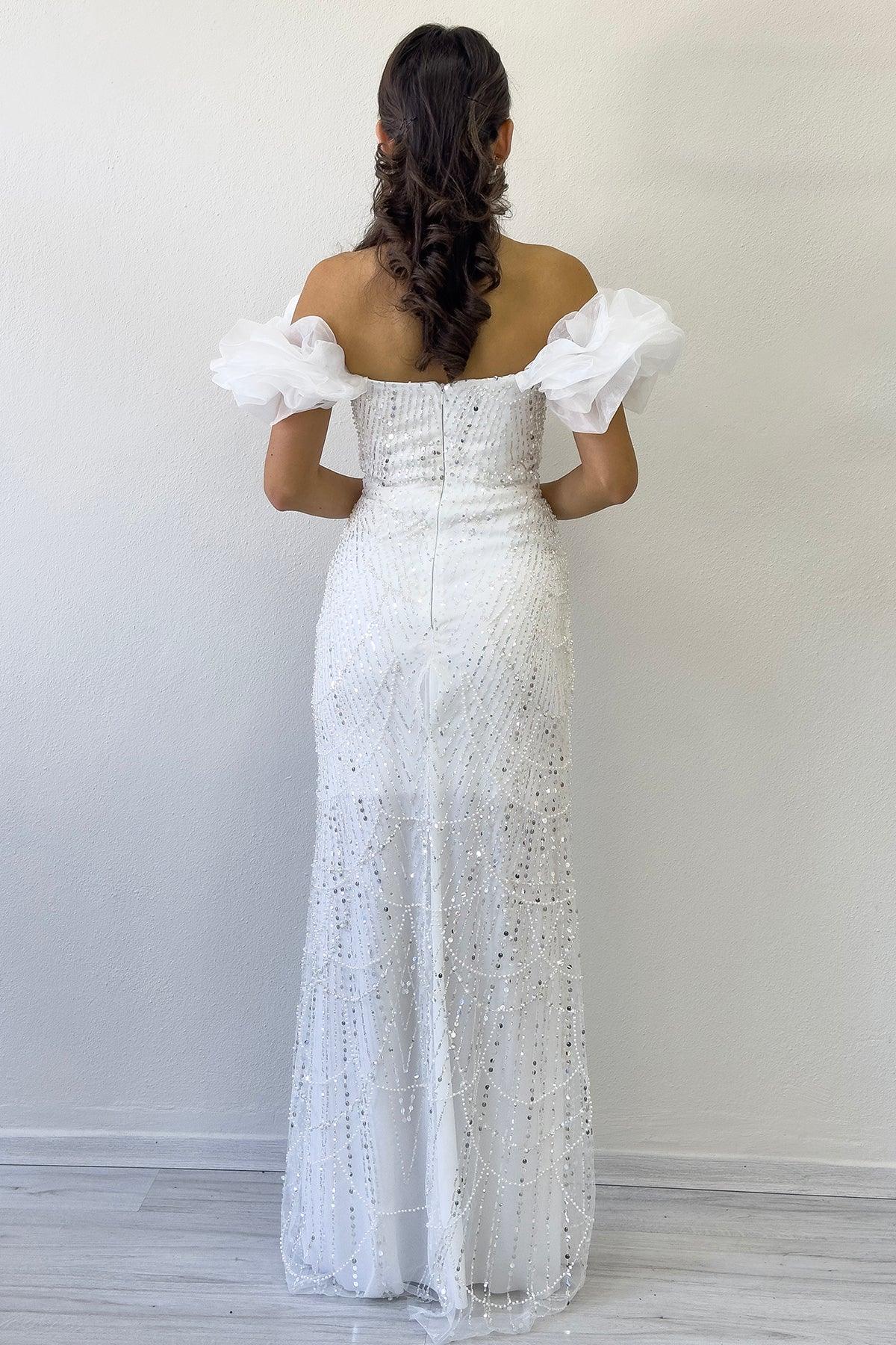 The Women's White Balloon Sleeve Sequin Embroidered Strapless Evening Dress is a stunning design that combines elegance and modern details. Thanks to its sparkling sequin embroidery, this model attracts attention in any setting, while the balloon sleeve detail adds a romantic and fairy-tale feel. The strapless neckline accentuates the shoulders and neckline, creating a feminine silhouette. With its white colour, this evening dress is particularly suitable for engagements, weddings, proposals and special invitations, offering a simple yet impressive look with its elegance. The high-quality fabric provides comfort for long-term wear, while the modern cut gracefully reveals the body's contours. It is an excellent choice for those who want to experience both comfort and elegance on special occasions. Available in a wide range of sizes from XS to plus size, this dress suits different body types. Paired with heels and minimal jewellery, it creates a sophisticated look, while statement earrings and a clutch bag give it a bold appearance.