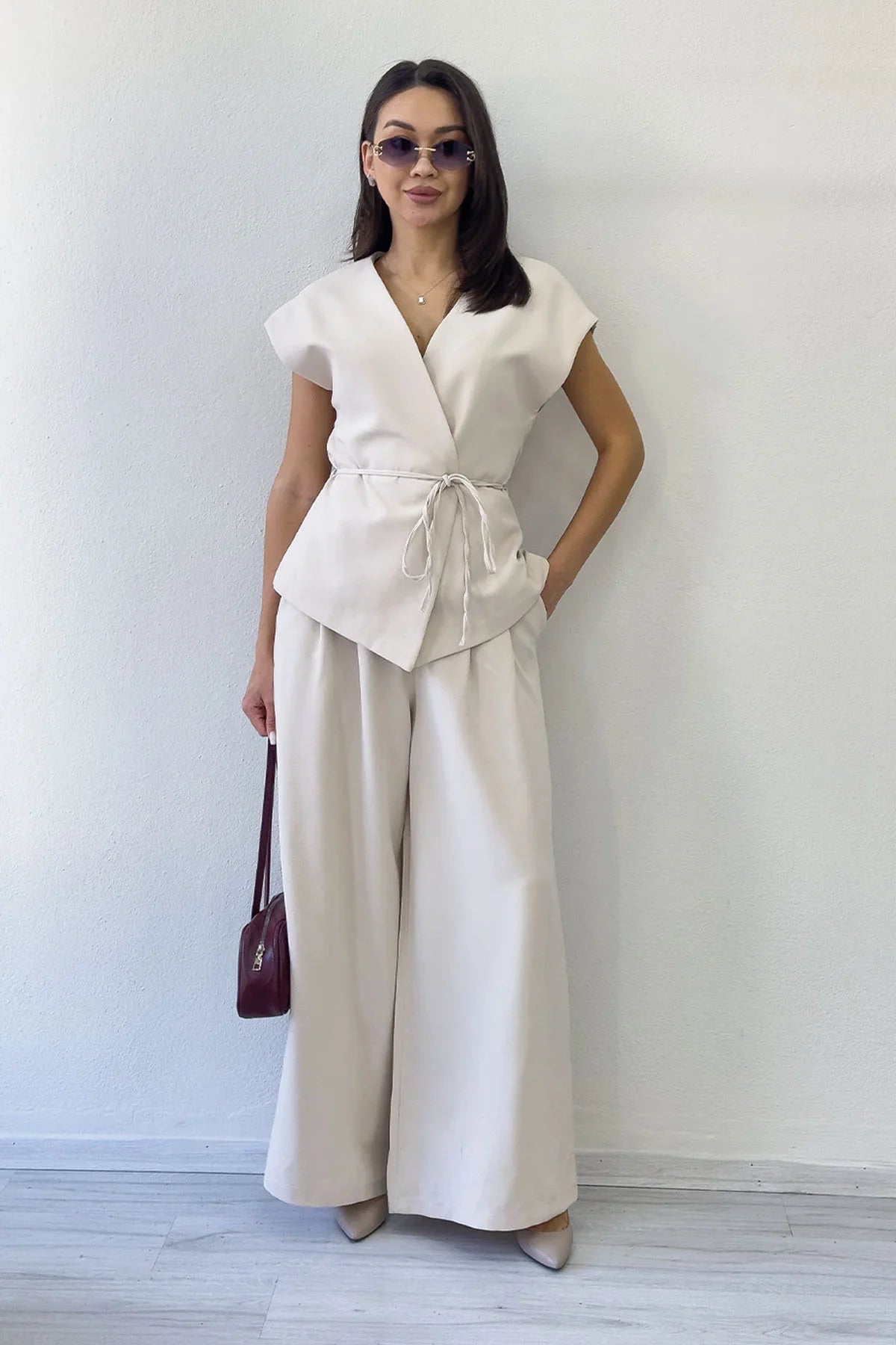 Dieses zweiteilige Ensemble aus cremefarbener, weit geschnittener Weste und Hose mit Drapierung und Bindeband verleiht Ihrer Garderobe mit seinem eleganten und modernen Look eine raffinierte Note. Die Bindebänder an der Weste betonen elegant die Körperkonturen und sorgen für eine schicke Silhouette. Die bequeme, weit geschnittene Hose bietet ganztägigen Tragekomfort, während der drapierte Schnitt die Eleganz unterstreicht. Ob im Büro oder zu besonderen Anlässen – dieses vielseitige Set sorgt für einen stilvollen Auftritt vom Tag bis in die Nacht. Der neutrale Cremeton lässt sich mühelos mit verschiedenen Accessoires und Schuhen kombinieren. Es passt sowohl zu klassischen High Heels als auch zu Sneakers und unterstreicht so unterschiedliche Stile. Farbe: Creme Details: Weste mit Bindeband, drapierter Stoff, weite Hose Passform: Lockere Passform Anlass: Berufsleben, Veranstaltungen, Eleganz im Alltag