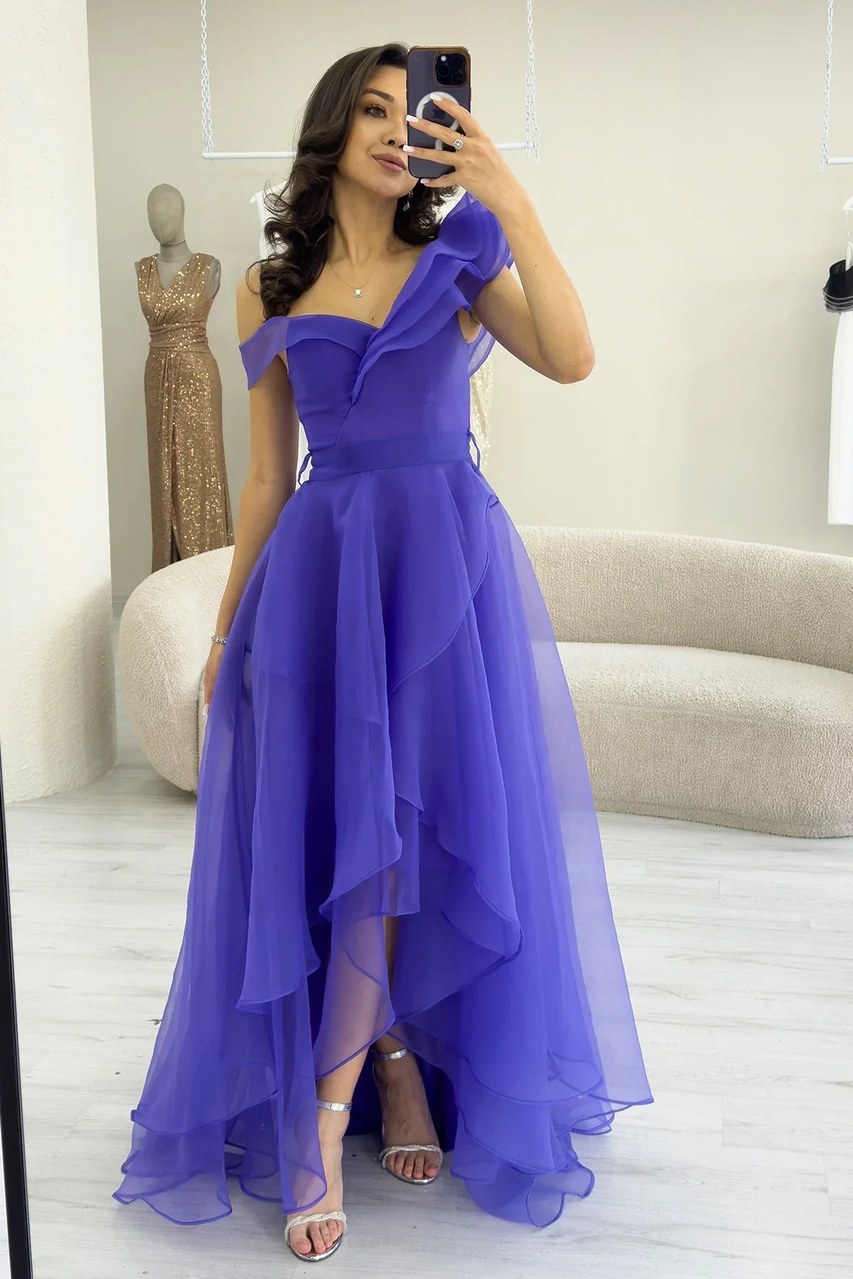 Lila asymmetrisches Tüll-Abendkleid