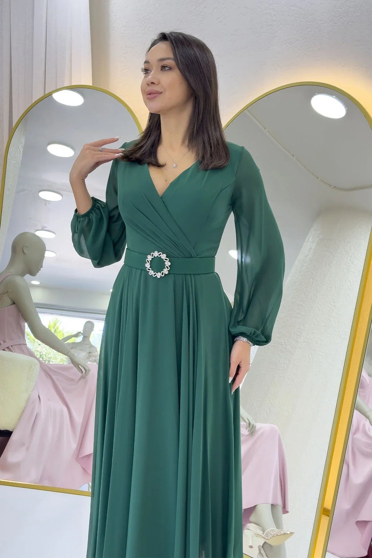 Combining elegance and comfort, this chiffon dress will make you stand out on your special occasions. The crossover neckline detail offers a feminine look, while the belt at the waist elegantly accentuates your figure. The lightweight chiffon fabric, infused with the energy of green, provides both style and comfort with its midi length cut. ✨ Key Details: A modern and elegant look with a crossover neckline A form-fitting silhouette thanks to the waist belt Lightweight and flowing chiffon fabric The perfect balance of elegance and comfort with a midi length. This dress, which you can confidently choose for parties, graduations or special dinners, will become an essential part of your wardrobe.